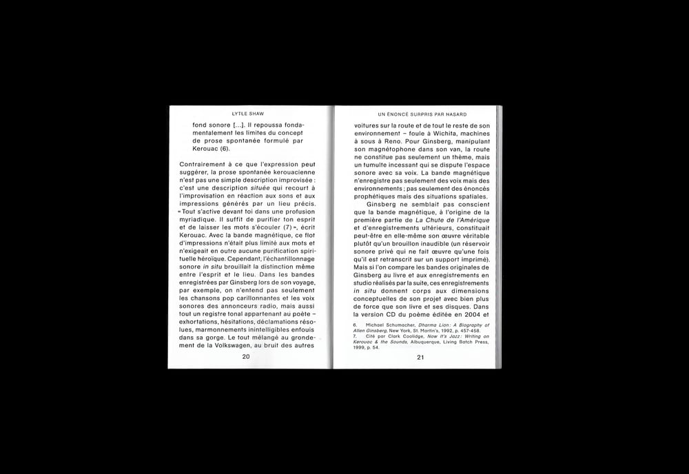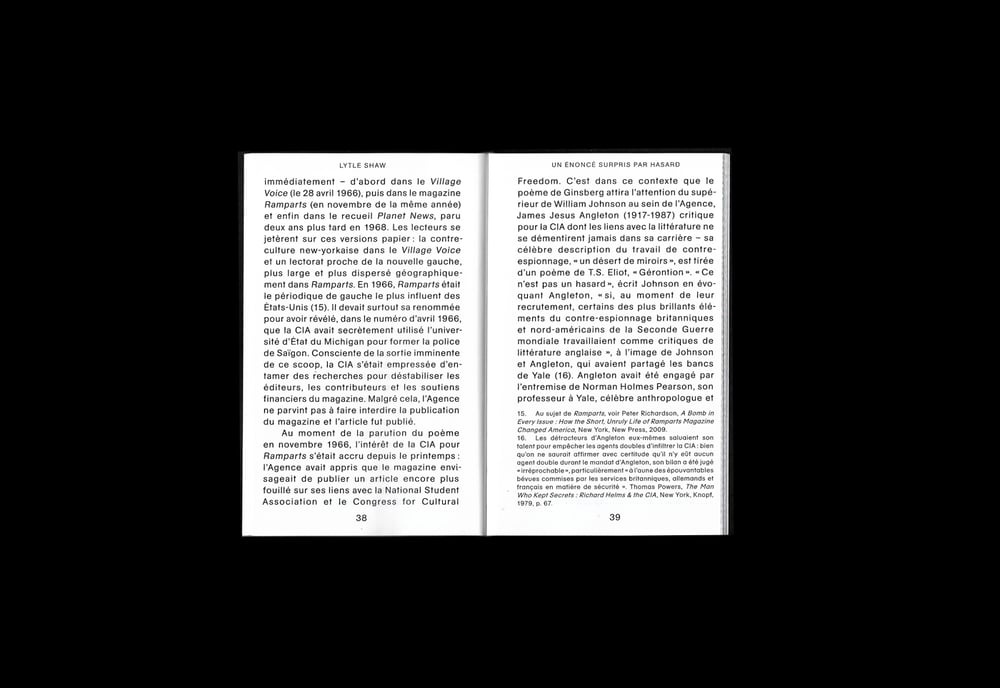 Lorsqu’Allen Ginsberg s’enregistre sur un magnétophone et capte fortuitement des émissions de radio, le souffle du vent et des conversations, des agents du FBI et de la CIA l’écoutent, à la recherche d’aveux involontaires. En considérant ces agents comme de sérieux théoriciens de la poésie, Lytle Shaw montre qu’ils s’inspirent des expérimentations d’avant-garde et transforment une technique libératrice en un outil répressif.