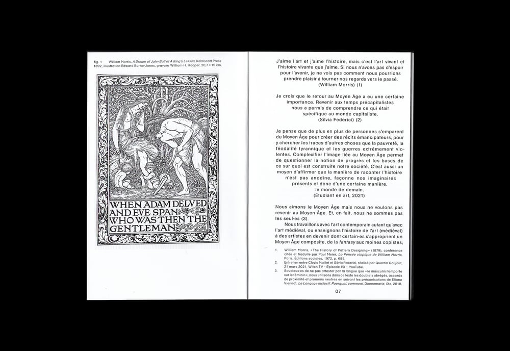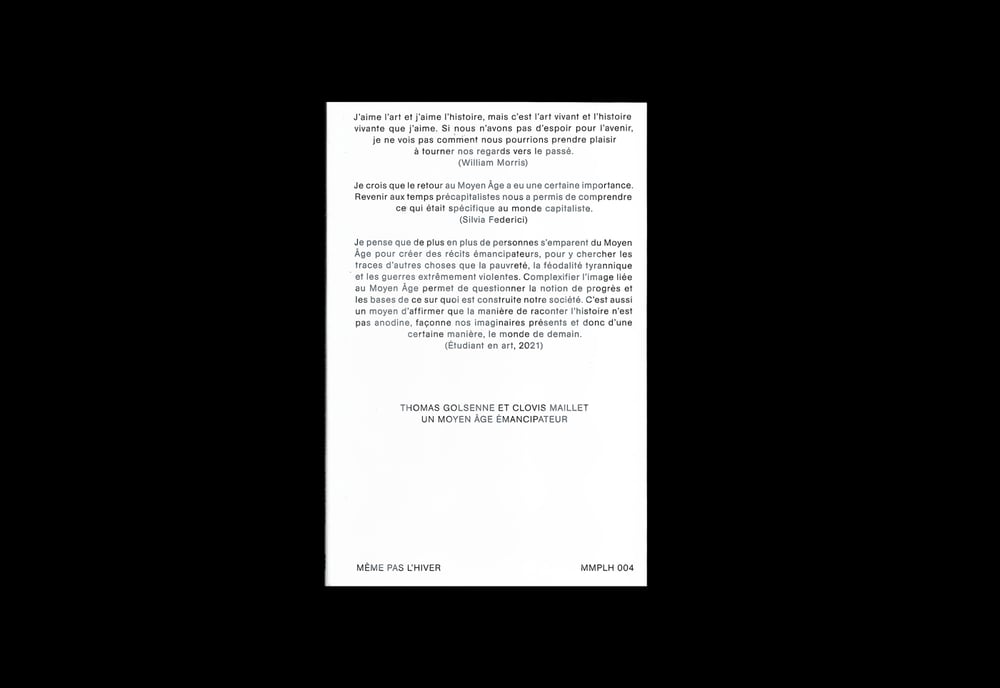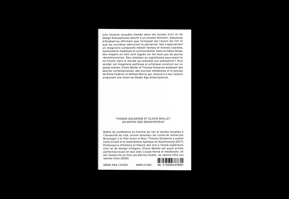 Une récente enquête menée dans les écoles d’art et de design francophones aboutit à un constat étonnant : beaucoup d’étudiante·s affirment que l’artisanat est l’avenir de l’art et que les sorcières détruiront le patriarcat. Iels s’approprient un imaginaire composite mêlant fantasy et moines copistes, herboristerie médiévale et communalisme. Dans le même temps, des slogans en latin sont tagués sur les murs par de jeunes révolutionnaires. Des remèdes au capitalisme pourraient-ils se trouver dans le monde qui précéda son avènement ? Pour sonder cet imaginaire politique et artistique construit sur un passé lointain, Clovis Maillet et Thomas Golsenne analysent des œuvres contemporaines, des sources médiévales et la pensée de Silvia Federici et William Morris qui, chacun·e à leur endroit, proposent une vision du Moyen Âge émancipatrice.